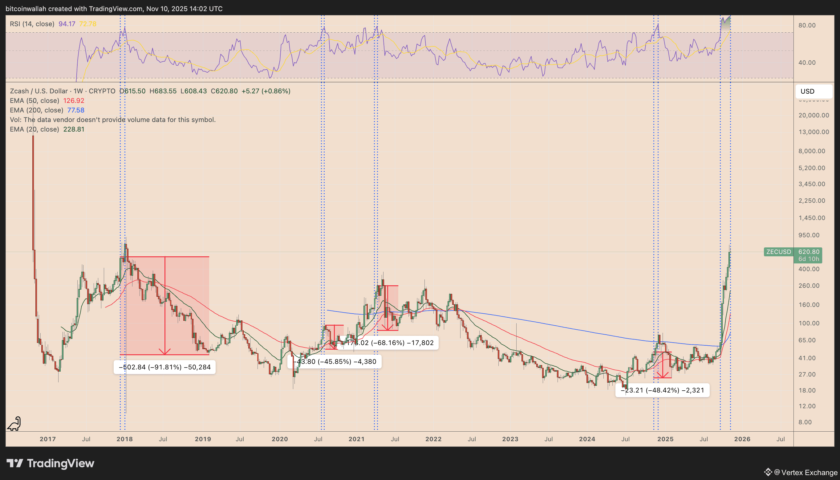 $ZEC ha alcanzado su nivel de sobrecompra más alto jamás registrado, lo que aumenta el riesgo de una fuerte corrección de 60% o más en las próximas semanas.
