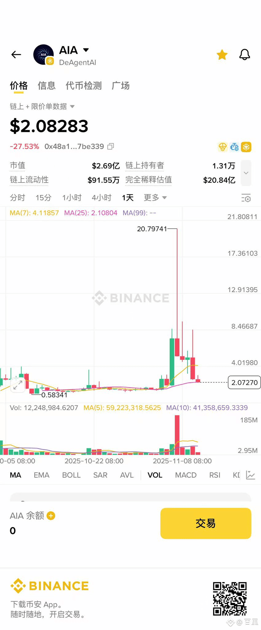 最近 $AIA 的行情终于安静了一点,从高点 45U 回到 2U 附近,像是一场暴风雨后的喘息。可越是这种时候,越让人想问——这真的是结束,还是下一轮的积蓄?