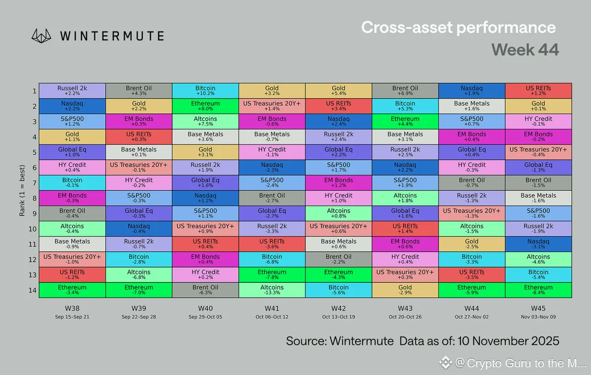 → Crypto (BTC, ETH, Altcoins) đang tụt hạng, trong khi vàng & tín dụng nhích lên.