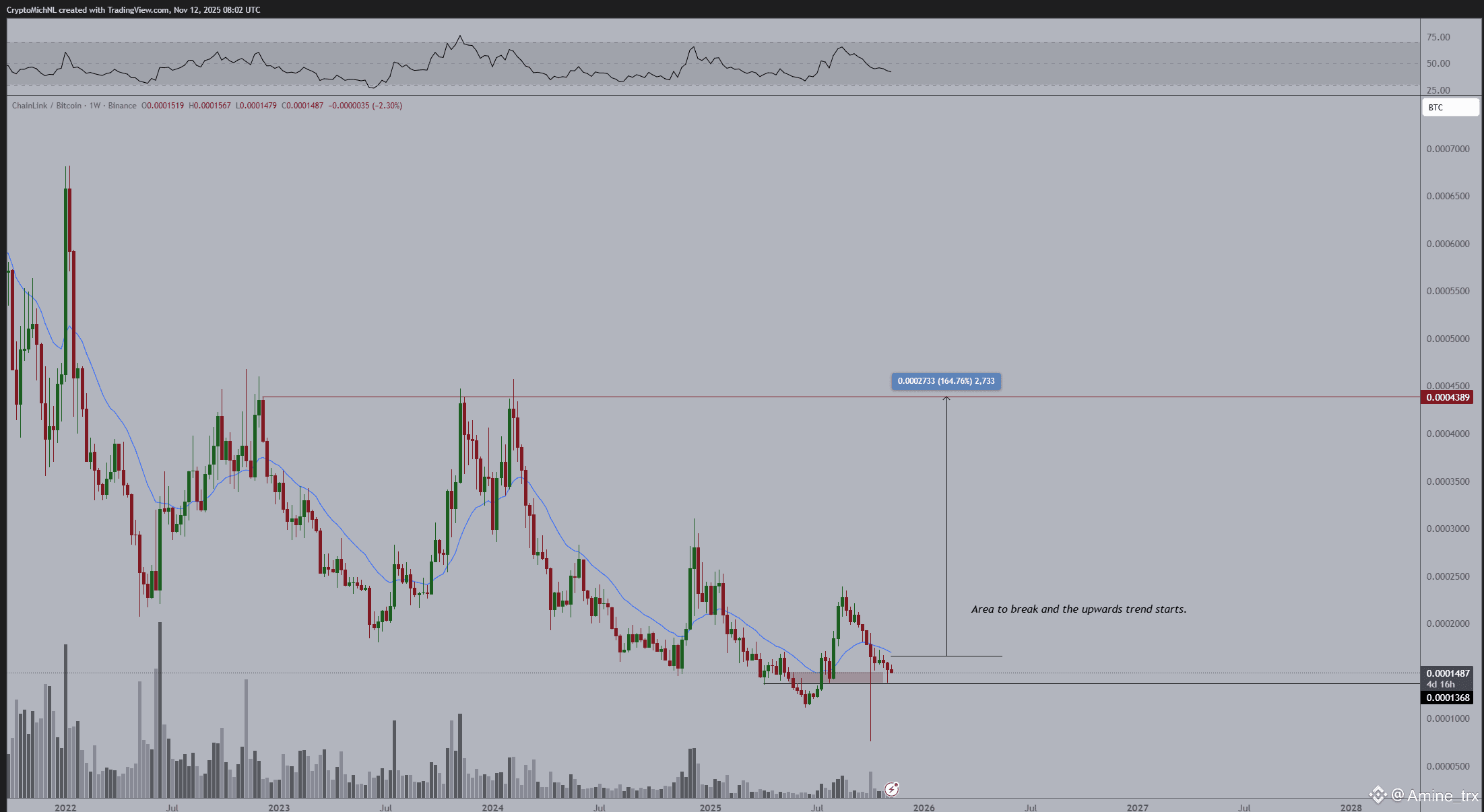 📊 من منظور فني، يُظهر الرسم الأسبوعي أن العملة مرّت بمسارٍ هبوطي طويل منذ قمّتها في عام 2021، تخلّلته قمم وقيعان متراجعة. لكن مع مطلع عام 2025، بدأ هذا الاتجاه يضعف تدريجيًا، حيث استقر السعر داخل نطاقٍ ضيّق بين 0.0001368 BTC و 0.000250 BTC — وهي منطقة تُعرف عادة بمرحلة “الهدوء قبل الانفجار” 💥