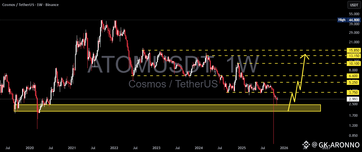 Cosmos (ATOM) is now standing at its most critical point in recent years, precisely within the historical support zone of 2.45–1.95, which has served as a major accumulation area since the early phase of the 2020 bull run. This zone isn’t just a number—it represents the psychological foundation of ATOM’s market.