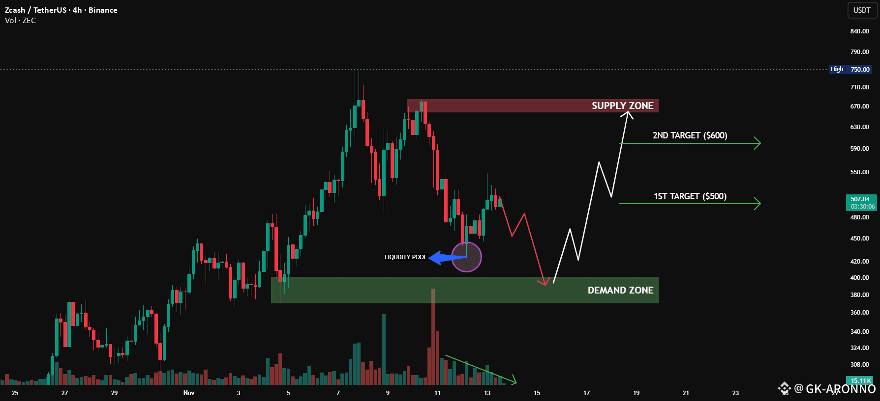 ZEC has formed a liquidity pool below key lows with declining volume, hinting at a potential liquidity grab before reversal. A successful tap into the $400–$370 demand zone could trigger a move toward $500 and $600 respectively. Holding above demand keeps the bullish recovery setup intact.