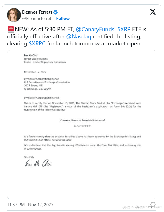As of 5:30 PM ET, November 12, Nasdaq certified the listing, clearing $XRP XRPC for trading at the market open on November 13. This marks a historic moment for XRP and the broader digital asset space.