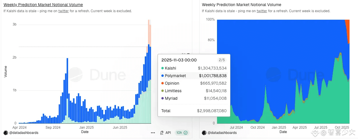 最近一周交易量约13亿美元,已经快追上老大哥Polymarket的10亿了!