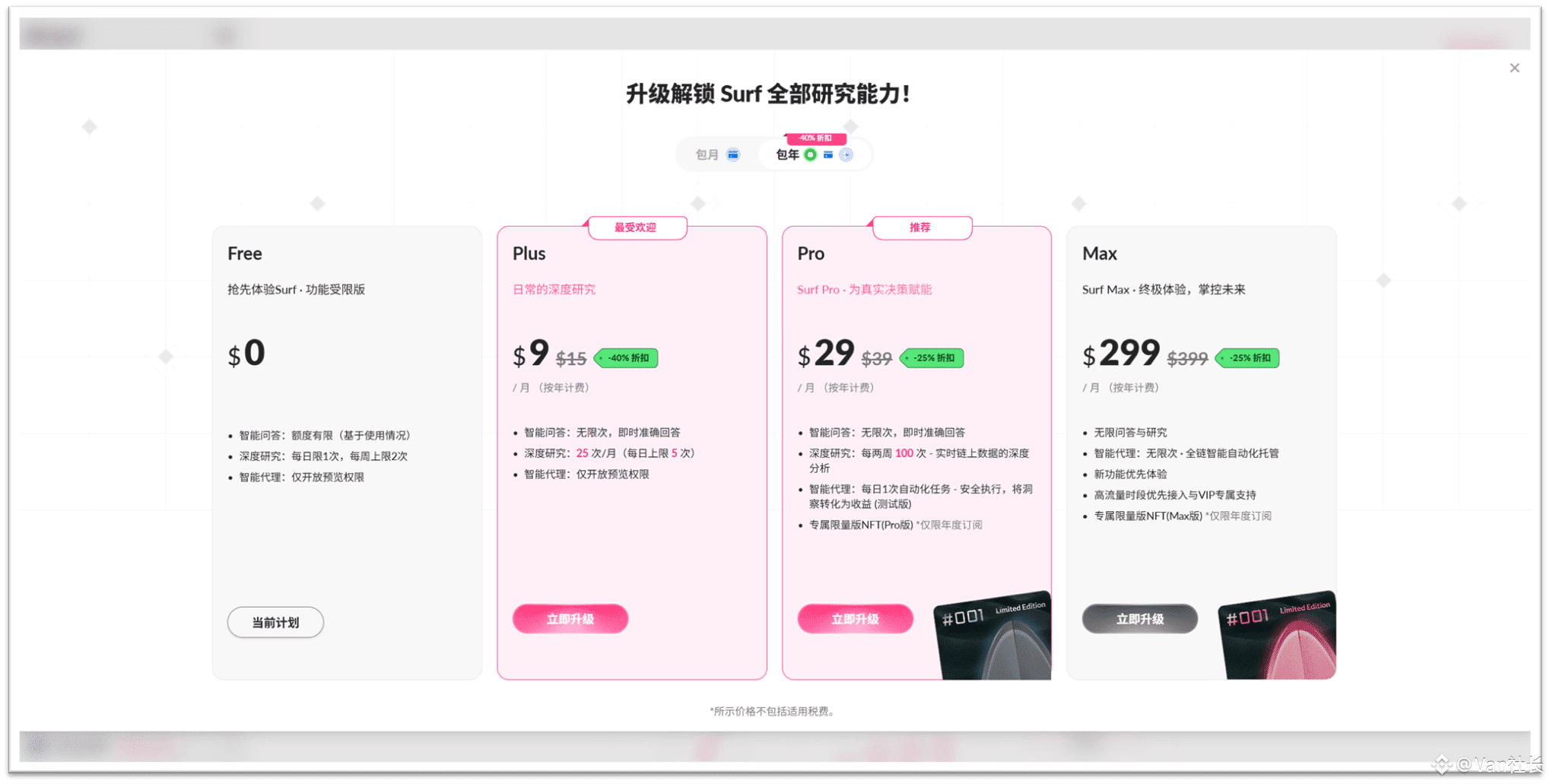 5️⃣成本高效:Free 版免费试用,Plus/Pro 订阅性价比高(年付 40% 优惠),无代币风险(Surf 暂无 Token 计划)。