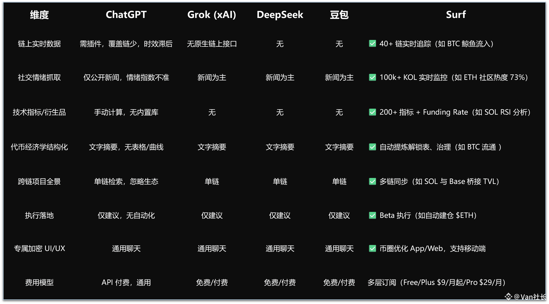这些通用 AI 在语言生成上优秀,但缺乏加密专属基础设施,导致整体分析浅显、时效差。以下基于代币/项目分析维度对比: