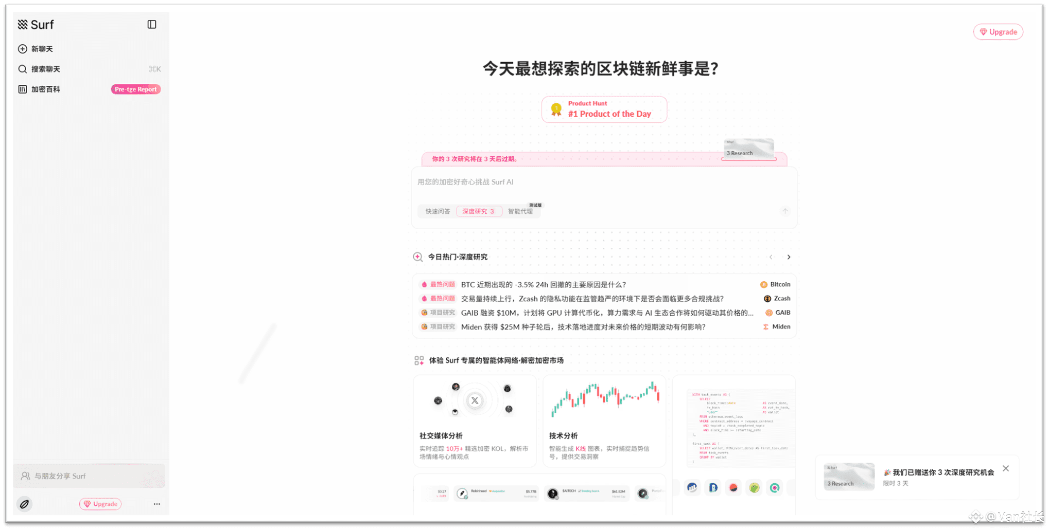 使用体验:Surf 的报告包含图表、风险提示和执行建议,远超通用 AI 的纯文字。免费版 Research 限额已够日常,Pro 版更能解锁 100 次/两周深度分析。