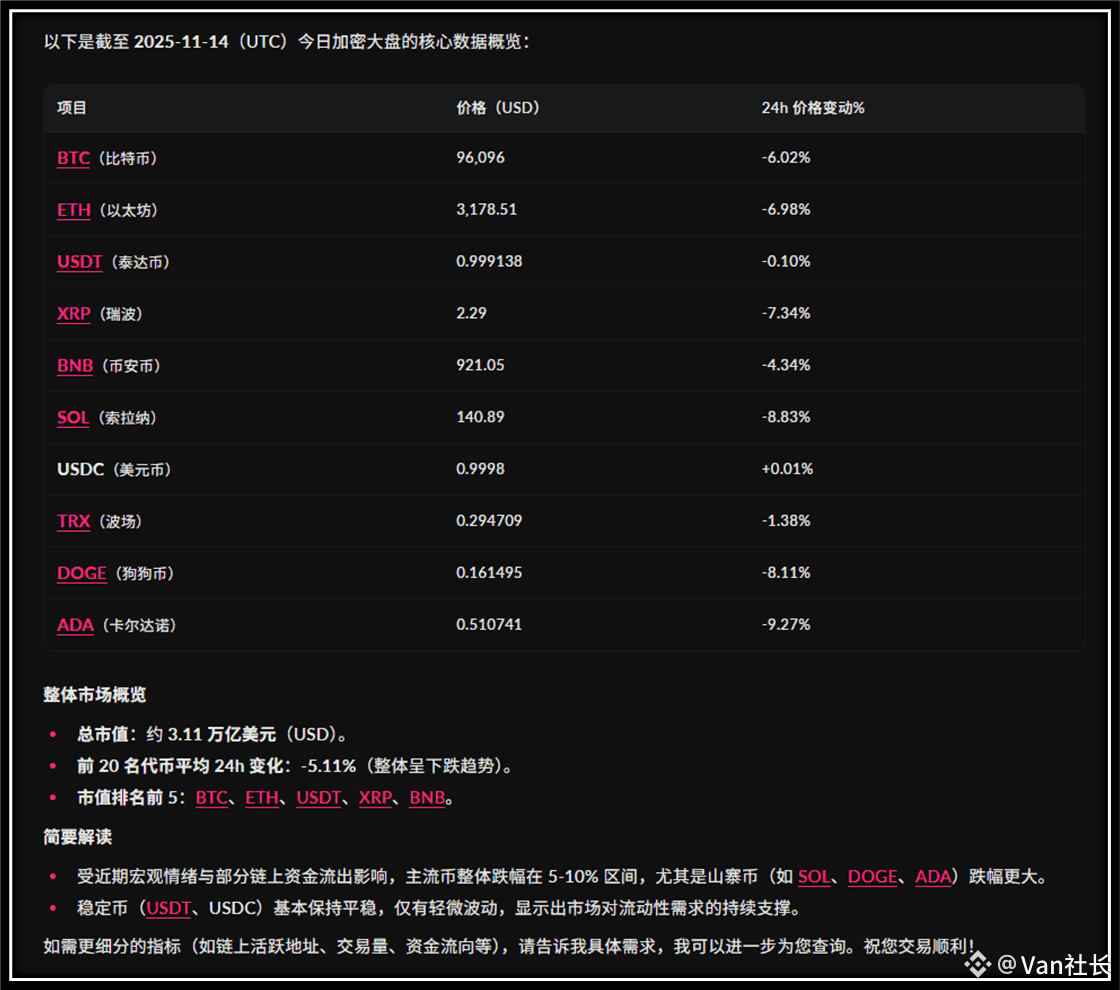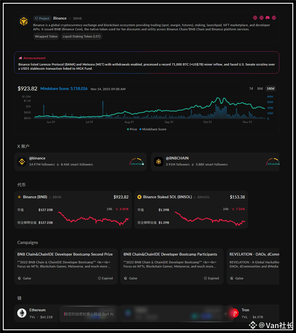 根据 2025-11-15 市场数据,全市场总市值达 $3.31T,24h 平均跌幅 -6.58%,这种环境下,AI 必须提供即时、全面的整体分析,才能帮你避坑抓机会。Surf 正是为此而生。