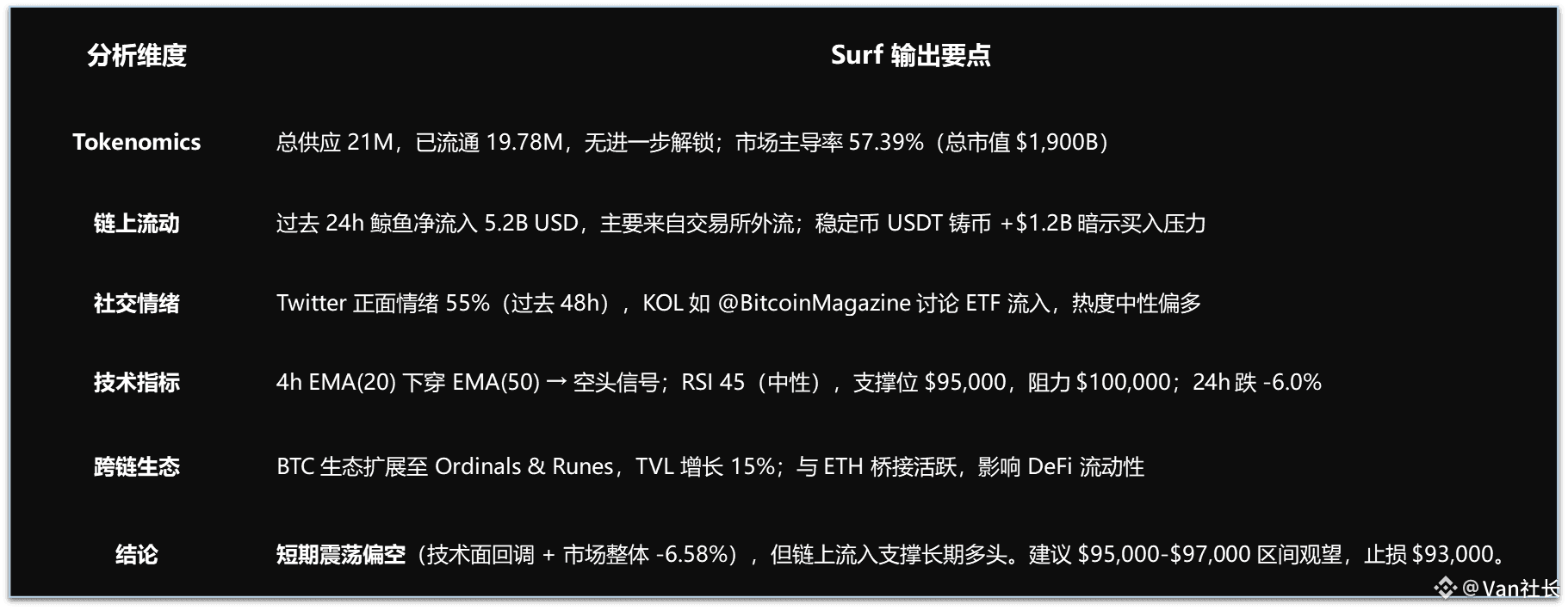 核心差异:Surf 原生集成链上 + 社交 + 技术数据源,提供结构化报告;其他模型需用户拼接,易出错且慢。举例:在市场大跌(24h -6.58%)时,Surf 能即时输出“整体看空但 ETH 支撑位 $3,100”,而通用 AI 只能泛谈“市场波动”。