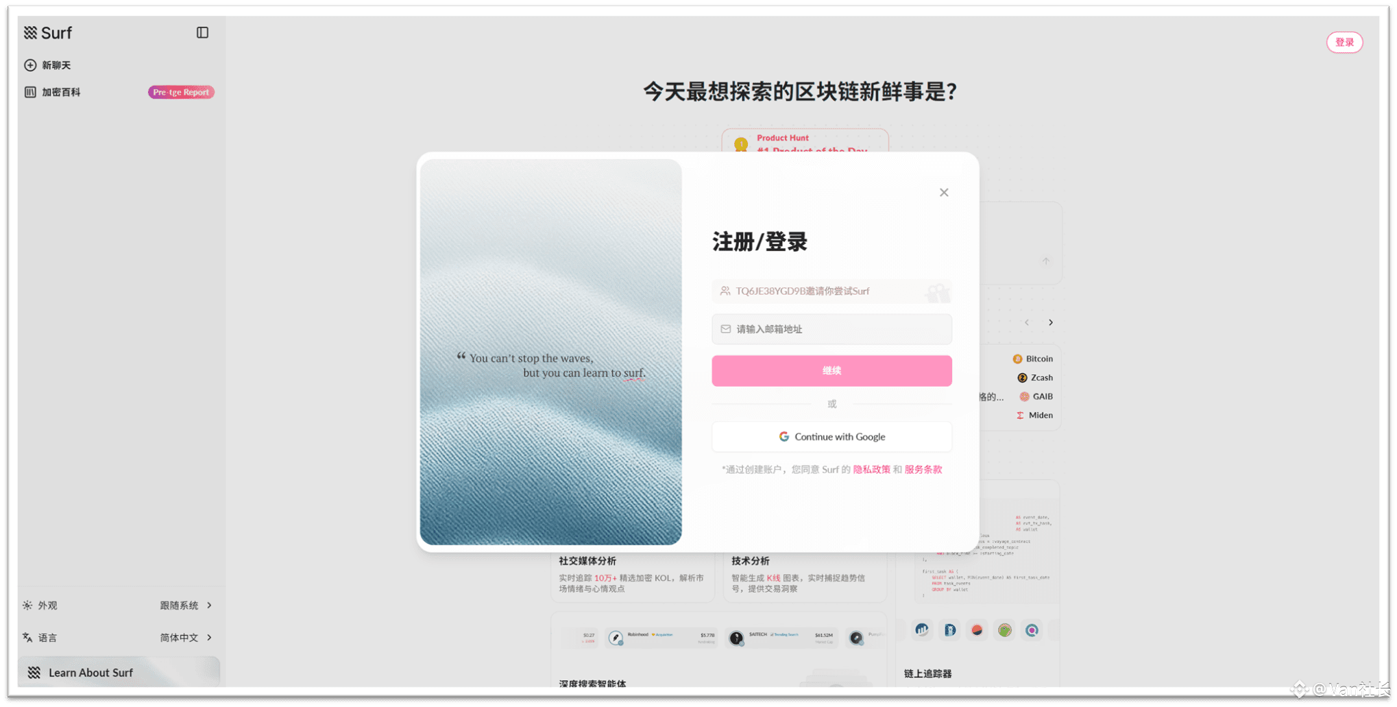 - 立即注册:访问 asksurf.ai,用邮箱或google账号注册开通。邀请码填TQ6JE38YGD9B,可以免费享受 3 天 PRO 会员资格(8 次研究 + 无限提问)。