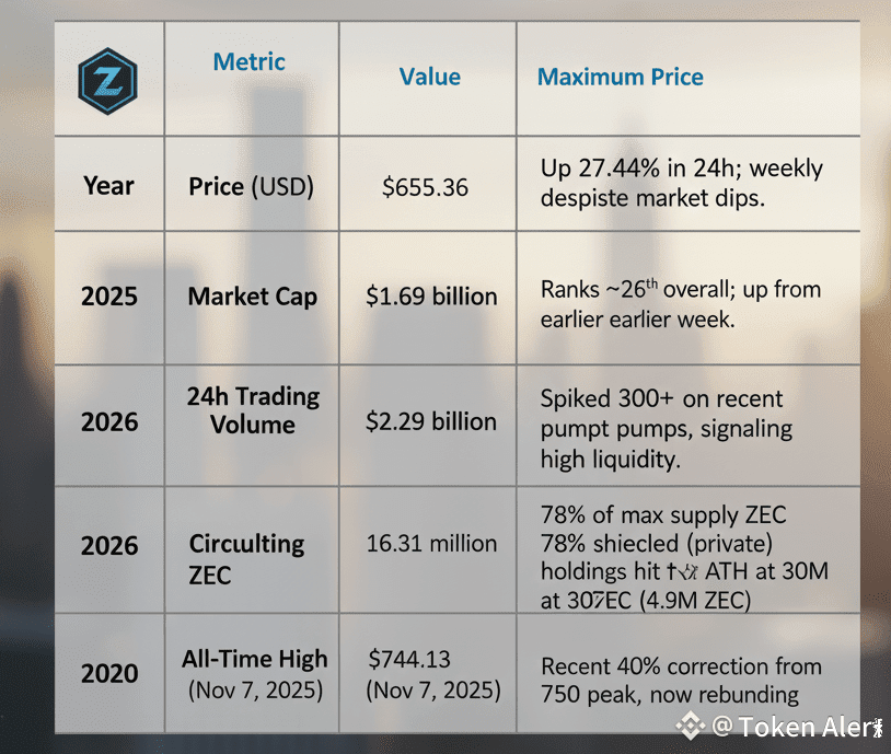 Zcash (ZEC) is a privacy-centric cryptocurrency launched in 2016, forked from Bitcoin and powered by zk-SNARK zero-knowledge proofs for optional shielded transactions. It maintains a fixed supply cap of 21 million tokens (like BTC), with halvings every four years—the next on November 15, 2025, reducing block rewards from 3.125 to 1.5625 ZEC. ZEC has surged in 2025 amid a privacy coin revival, up over 800-1,100% YTD, driven by institutional interest and on-chain growth. Below is a breakdown of the latest data, news, and outlook.Current Market DataZEC is trading at approximately $655.36 USD, reflecting a massive +27.44% surge in the last 24 hours amid broader privacy sector momentum. coinmarketcap.com This follows a pullback from its all-time high of $744.13 on November 7, 2025. tradingview.com Here's a snapshot: