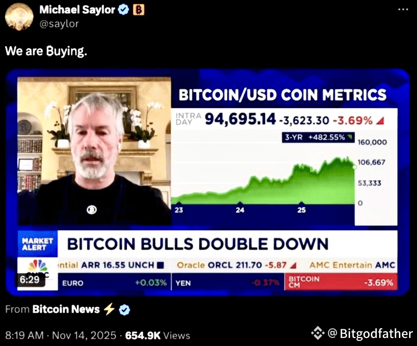Saylor said the company was continuously buying $BTC as the price dropped by more than 4% in less than 24 hours, from more than $100K to less than $95K.
