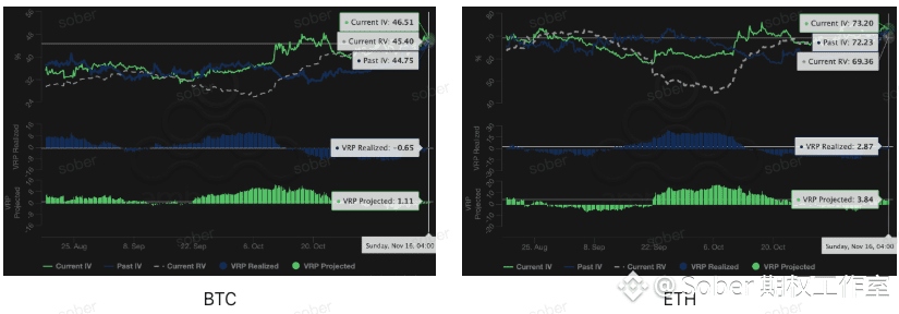 IV 抬升推动 VRP 收窄: 投资者基于对中短期不确定性的预期(宏观政策、地缘或流动性风险)上调了隐含波动率,从而使得 IV 与高位的 RV 差距缩小,VRP 变得不那么负或接近零。