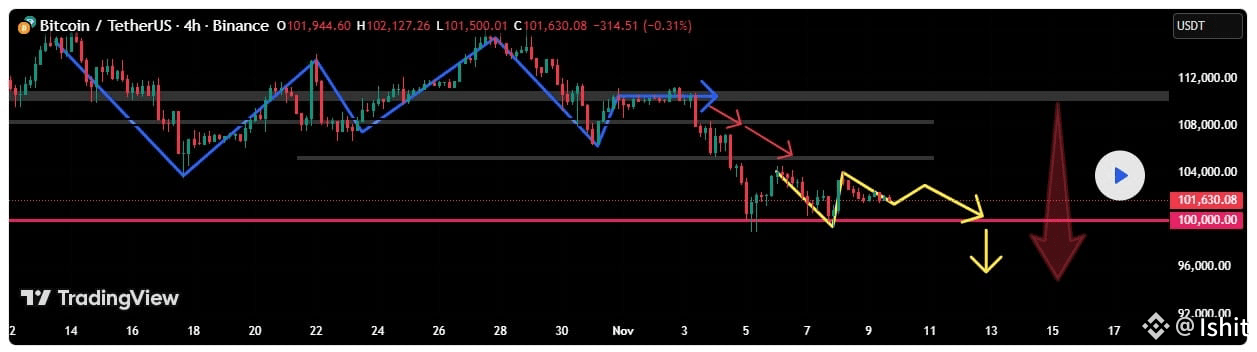 Bitcoin’s failure to hold the $100,000 psychological support confirms weakening momentum and heightens the probability of a deeper corrective wave.