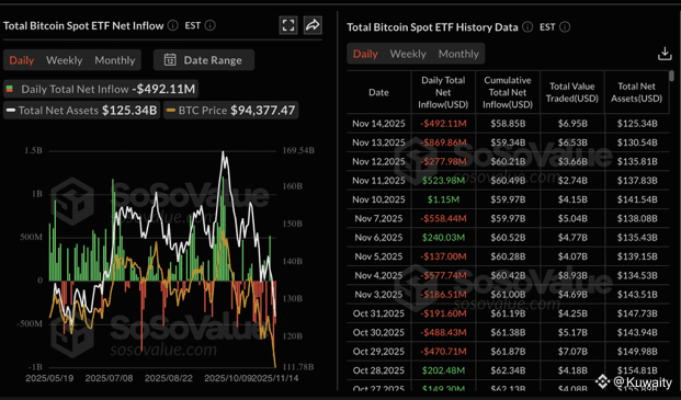 مددت صناديق الاستثمار المتداولة المدرجة في الولايات المتحدة (ETFs) سلسلة الانخفاض مع تدفقات خارجة تقارب 492 مليون دولار يوم الجمعة. وفقًا لبيانات SoSoValue، يبلغ متوسط حجم التدفقات الداخلة لصناديق البيتكوين 58.85 مليار دولار يوم الاثنين، مع صافي أصول يبلغ 125.34 مليار دولار.