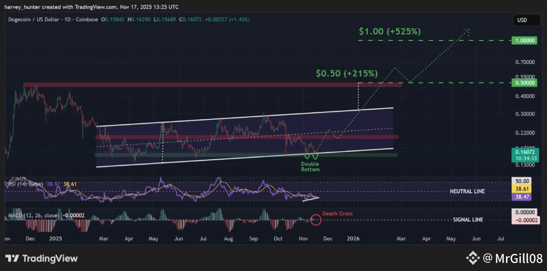 Once completed, a channel breakout opens the door for a 215% push to past highs around $0.50. But with Bitwise and Greyscale spot DOGE ETFs expected before year-end, fresh TradFi exposure could fuel a 525% push to $1 running into 2026.