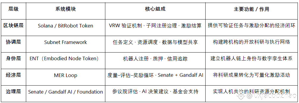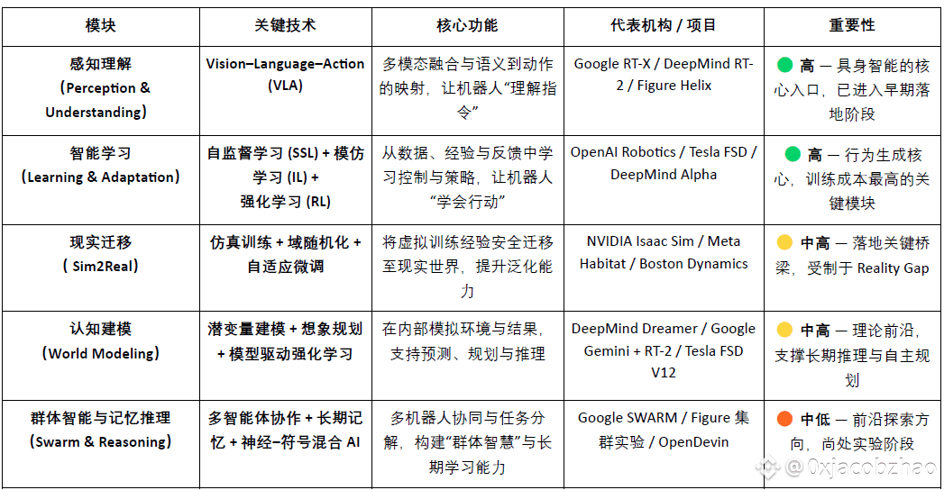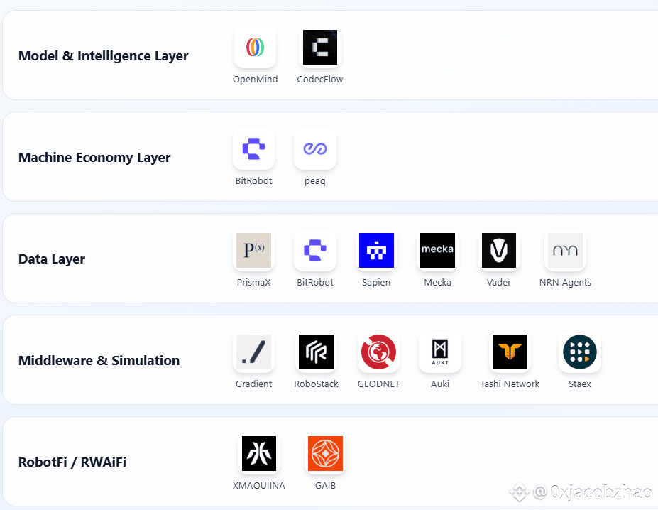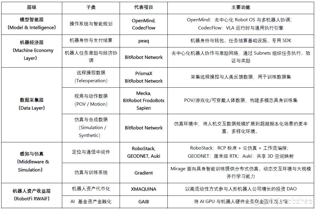 基于“可验证进展、技术公开度、产业相关度”三项标准,梳理当前 Web3 × Robotics 代表性项目,并按五层架构归类:模型智能层、机器经济层、数据采集层、感知与仿真基础层、机器人资产收益层。为保持客观,我们已剔除明显“蹭热点”或资料不足项目;如有疏漏,欢迎指正。