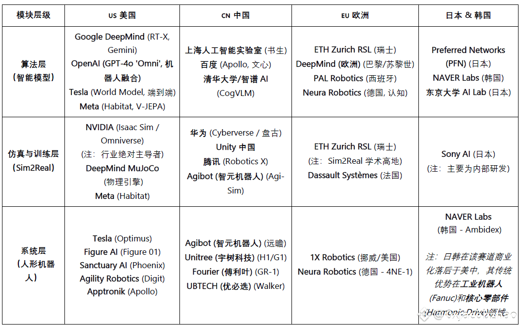 中国 凭借规模化制造、垂直整合与政策驱动,在零部件、自动化工厂与人形机器人领域形成领先优势,硬件与供应链能力突出,宇树与优必选等已实现量产,正向智能决策层延伸。但在 算法与仿真训练层与美国仍存较大差距。