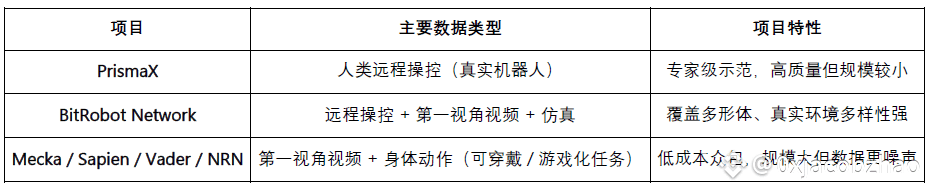 旨在解决具身智能训练中稀缺且昂贵的高质量现实世界数据。通过多种路径采集和生成人机交互数据,包括远程操控(PrismaX, BitRobot Network)、第一视角与动作捕捉(Mecka、BitRobot Network、Sapien、Vader、NRN)以及仿真与合成数据(BitRobot Network),为机器人模型提供可扩展、可泛化的训练基础。