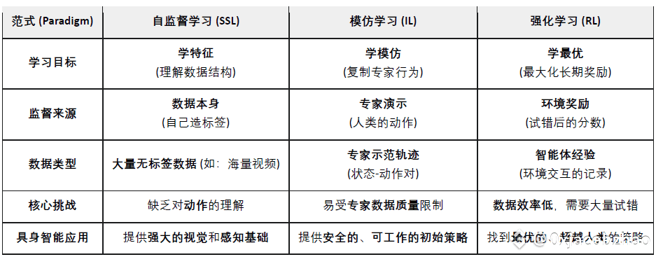 在 具身智能(Embodied AI) 中,自监督学习(SSL) 旨在让机器人通过感知数据预测状态变化与物理规律,从而理解世界的因果结构;强化学习(RL) 是智能形成的核心引擎,通过与环境交互和基于奖励信号的试错优化,驱动机器人掌握行走、抓取、避障等复杂行为;模仿学习(IL) 则通过人类示范加速这一过程,使机器人快速获得行动先验。当前主流方向是将三者结合,构建层次化学习框架:SSL 提供表征基础,IL 赋予人类先验,RL 驱动策略优化,以平衡效率与稳定性,共同构成具身智能从理解到行动的核心机制。