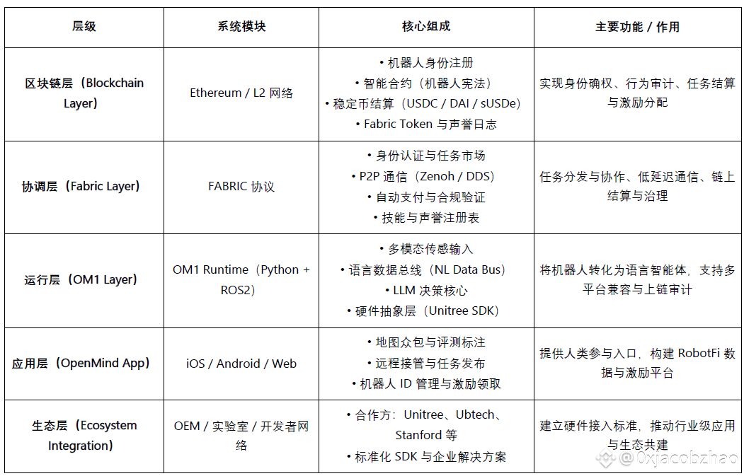 OpenMind 处于“技术可运行、商业未落地”的早期阶段。核心系统 OM1 Runtime 已在 GitHub 开源,可在多平台运行并支持多模态输入,通过自然语言数据总线(NLDB)实现语言到行动的任务理解,具备较高原创性但仍偏实验,Fabric 网络 与链上结算仅完成接口层设计。