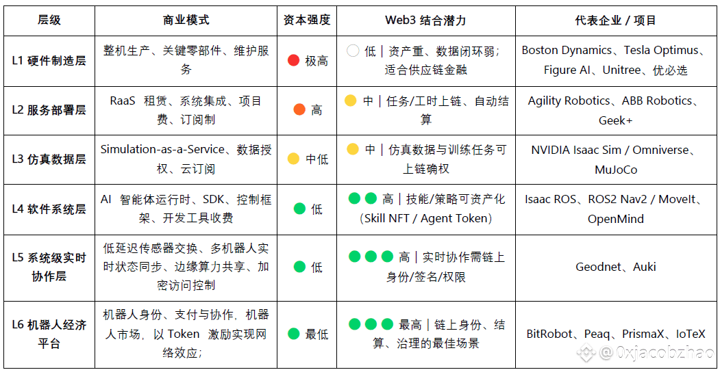 总体来看,短期主要集中在数据采集与激励层;中期有望在“稳定币支付 + 长尾数据聚合”及 RaaS 资产化与结算层 实现突破;长期,若人形机器人规模化普及,Web3 或将成为机器所有权、收益分配与治理的制度底层,推动真正的去中心化机器经济形成。