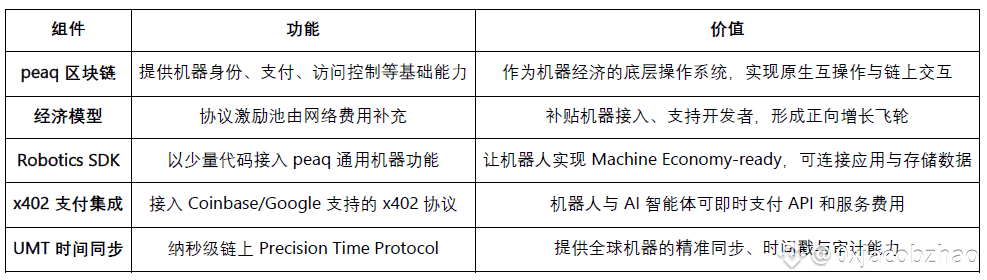 peaq 是专为机器经济打造的 Layer-1 区块链,为数百万台机器人与设备提供机器身份、链上钱包、访问控制以及纳秒级时间同步(Universal Machine Time)等底层能力。其 Robotics SDK 使开发者能够以极少代码让机器人“机器经济就绪”,实现跨厂商、跨系统的互操作性与交互。