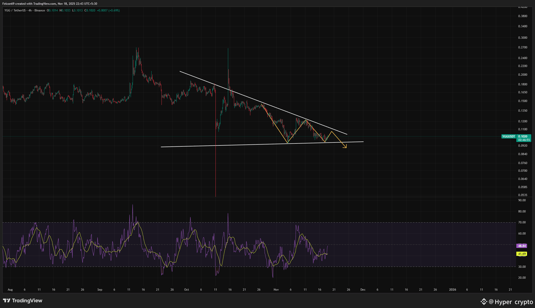 I can see descending triangle pattern. This pattern is marked by lower highs and a strong horizontal support level near $0.095. A descending triangle is classically a bearish continuation pattern ⬇️.The continuous selling pressure from the descending resistance line suggests that the support is vulnerable.The current technical setup suggests the bears 🐻 have the advantage and are trying to force a drop below that critical $0.095 support.