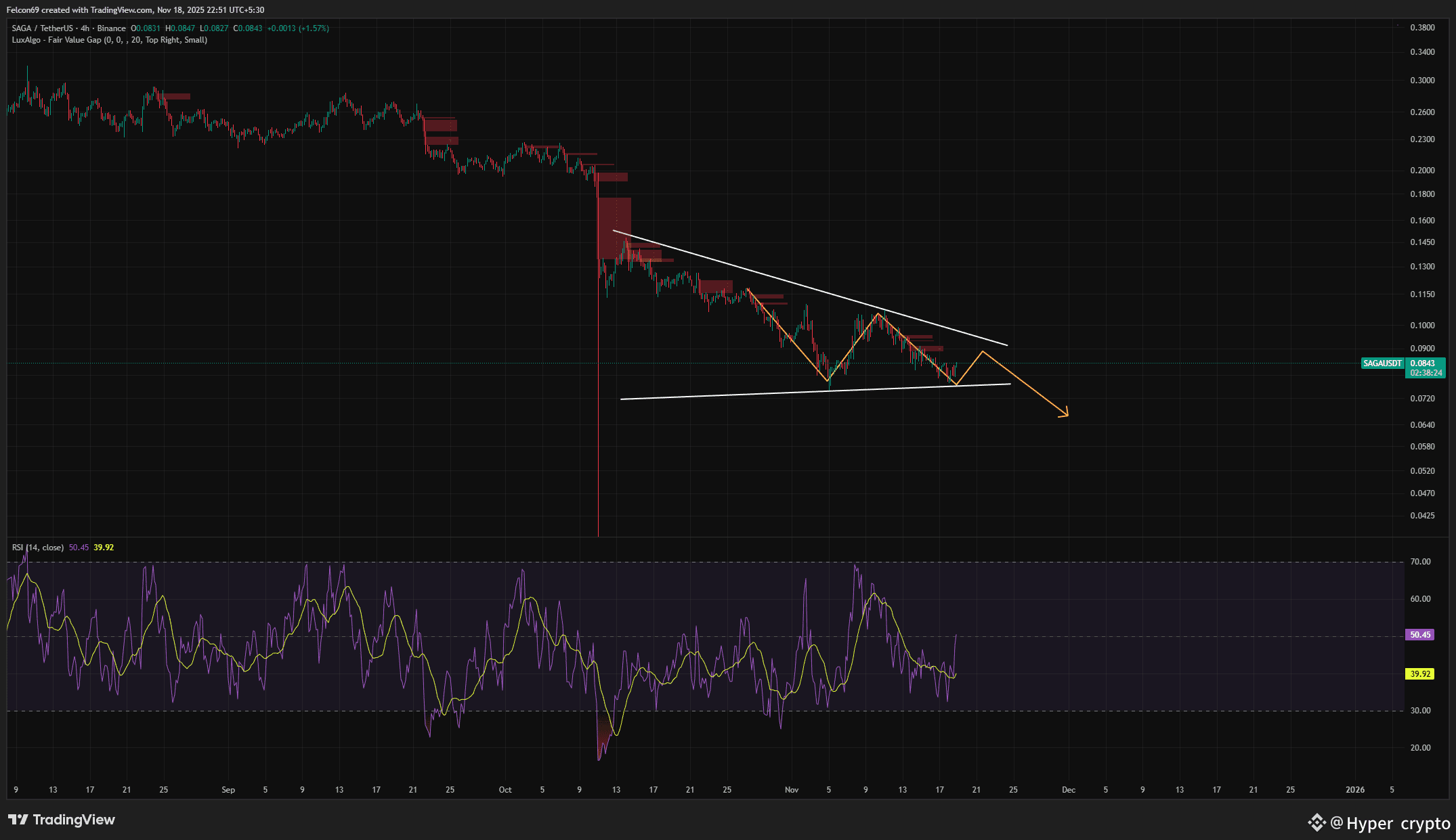 I can see on SAGA a symmetrical triangle pattern. This pattern is marked by converging trendlines. Given that it formed after a strong bearish move, it typically acts as a bear flag continuation pattern ⬇️. The price is compressing near the apex, and the projected path (orange arrow) suggests a likely breakdown 💥 below the lower trendline, aiming for the $0.07 area. The RSI (bottom) is neutral, allowing for a move in either direction.