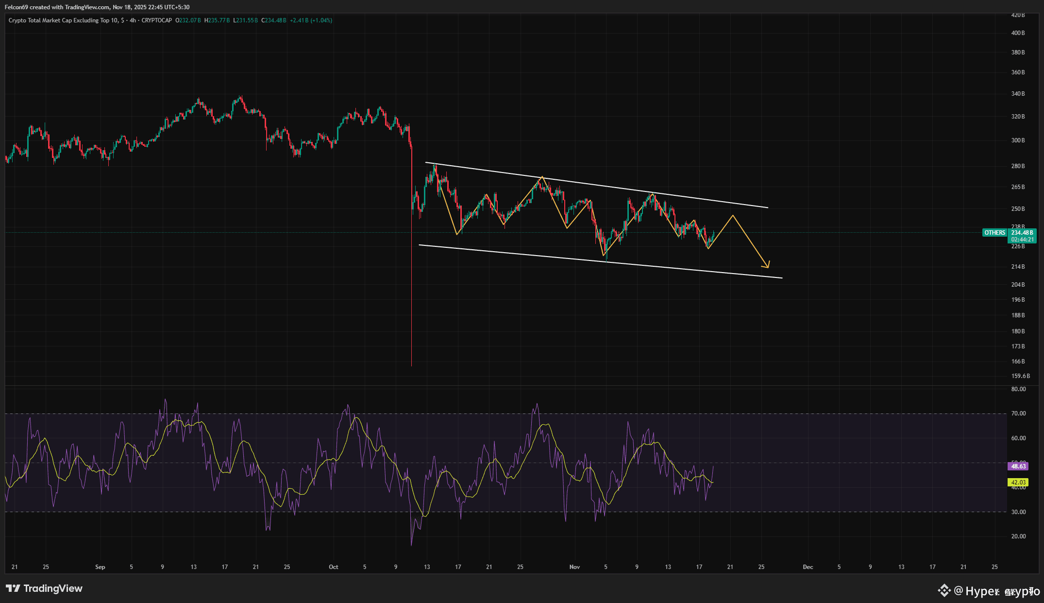 I can see on OTHERS.D has formed a descending channel 🔽 pattern, defined by two parallel, downward-sloping white trendlines. This is often a bull flag or bullish reversal pattern. The price is currently near the center. a move down to the lower boundary near $210B before initiating a strong rally and an eventual breakout 🚀 above the upper line.
