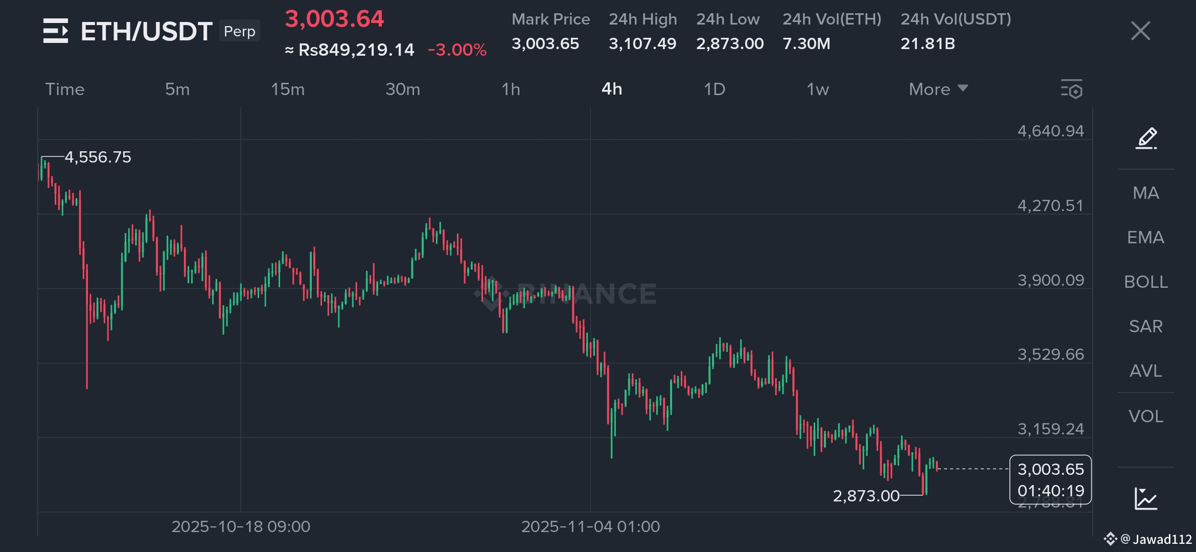 The price has fallen from a high around $4,556.75 (on Oct 18) to the current price of $3,003.64 (on Nov 20), hitting a recent low around $2,873.00. This demonstrates a strong bearish trend over the observed period.