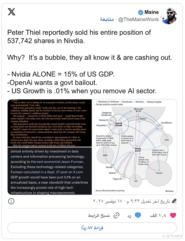 ومع ذلك، قلص المستثمرون المؤسسون، بما في ذلك بيتر ثييل وSoftBank، مؤخرًا من حصصهم في Nvidia و الشركات الكبرى في مجال الذكاء الاصطناعي، مما يشير إلى الحذر من التقييمات المرتفعة.