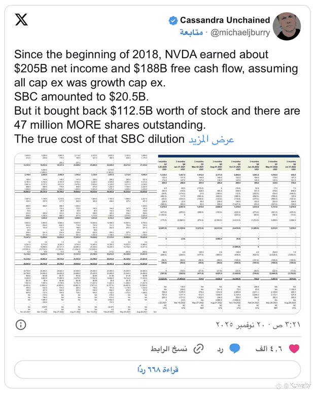 تشير تحليلات بيري إلى أن تعويضات الأسهم قد حجبت قوة أرباح Nvidia الحقيقية. وقد سجلت الشركة صافي دخل بقيمة $205 مليار وتدفق نقدي حر بقيمة $188 مليار منذ عام 2018.