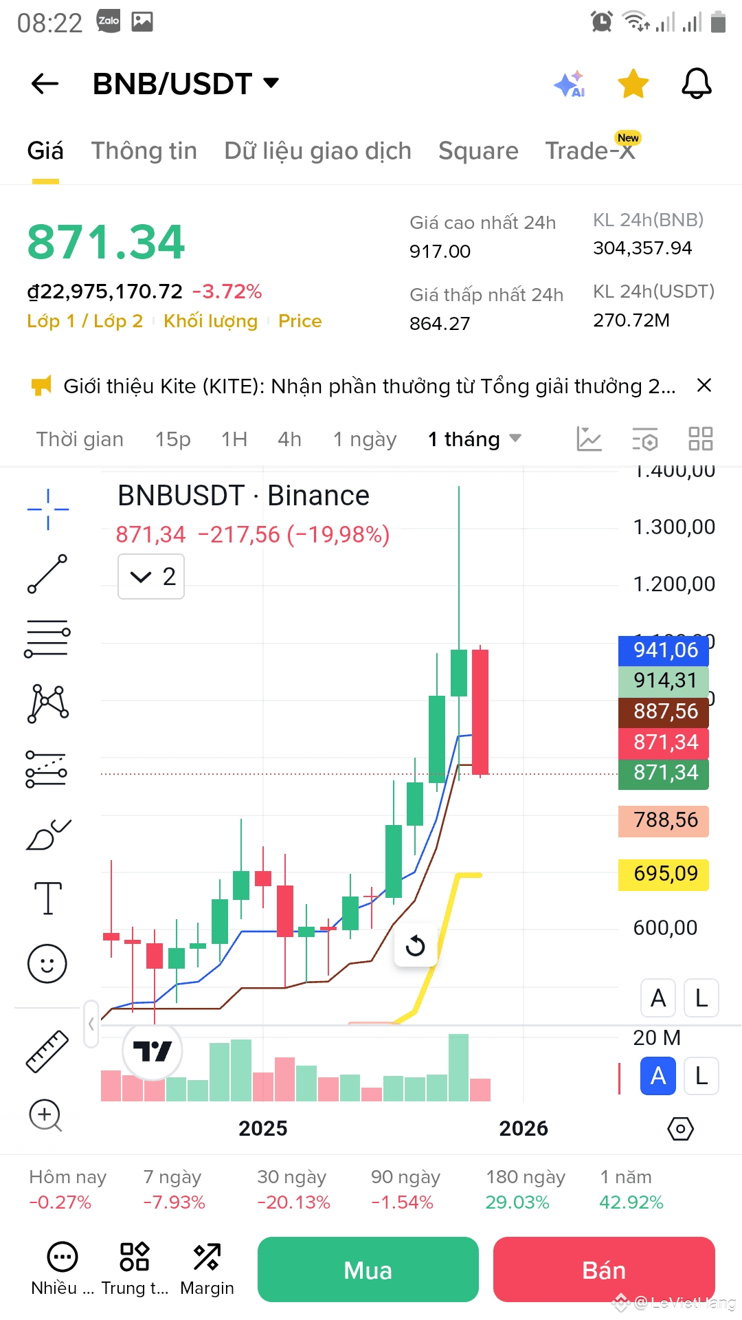 Dựa trên dữ liệu kĩ thuật, BNB hiện đang giao dịch ở mức 871,34. Trong tháng qua, BNB đã trải qua sự biến động đáng kể, với mức giảm 19,98%. Tuy nhiên, trong 180 ngày qua, BNB đã cho thấy sự phục hồi đáng kể với mức tăng 29,03%, và trong năm qua, mức tăng trưởng là 42,92%.