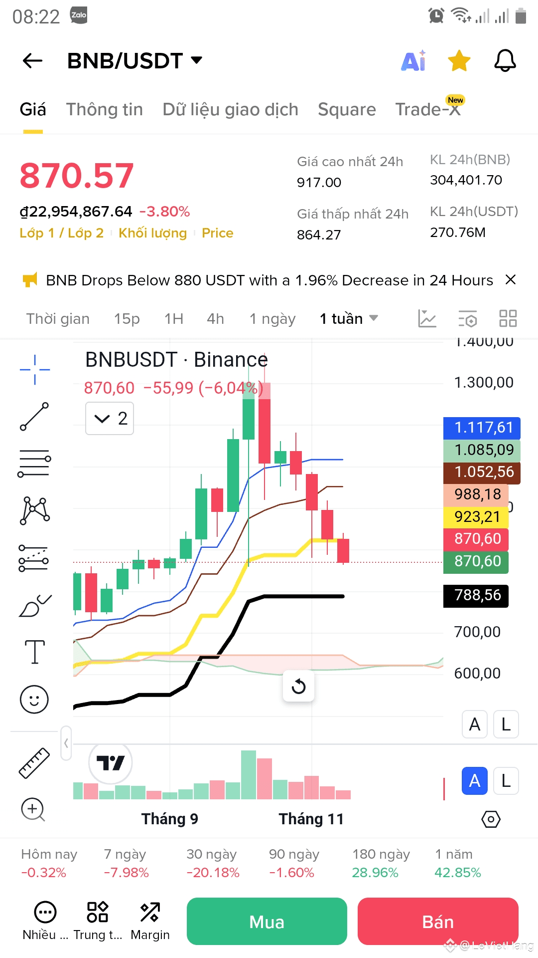 Hiện tại $BNB đang âm thầm đánh mất dẫn các mốc hỗ trợ quan trọng và lùi dần về mốc hỗ trợ sâu hơn 788 USD và 695 USD.