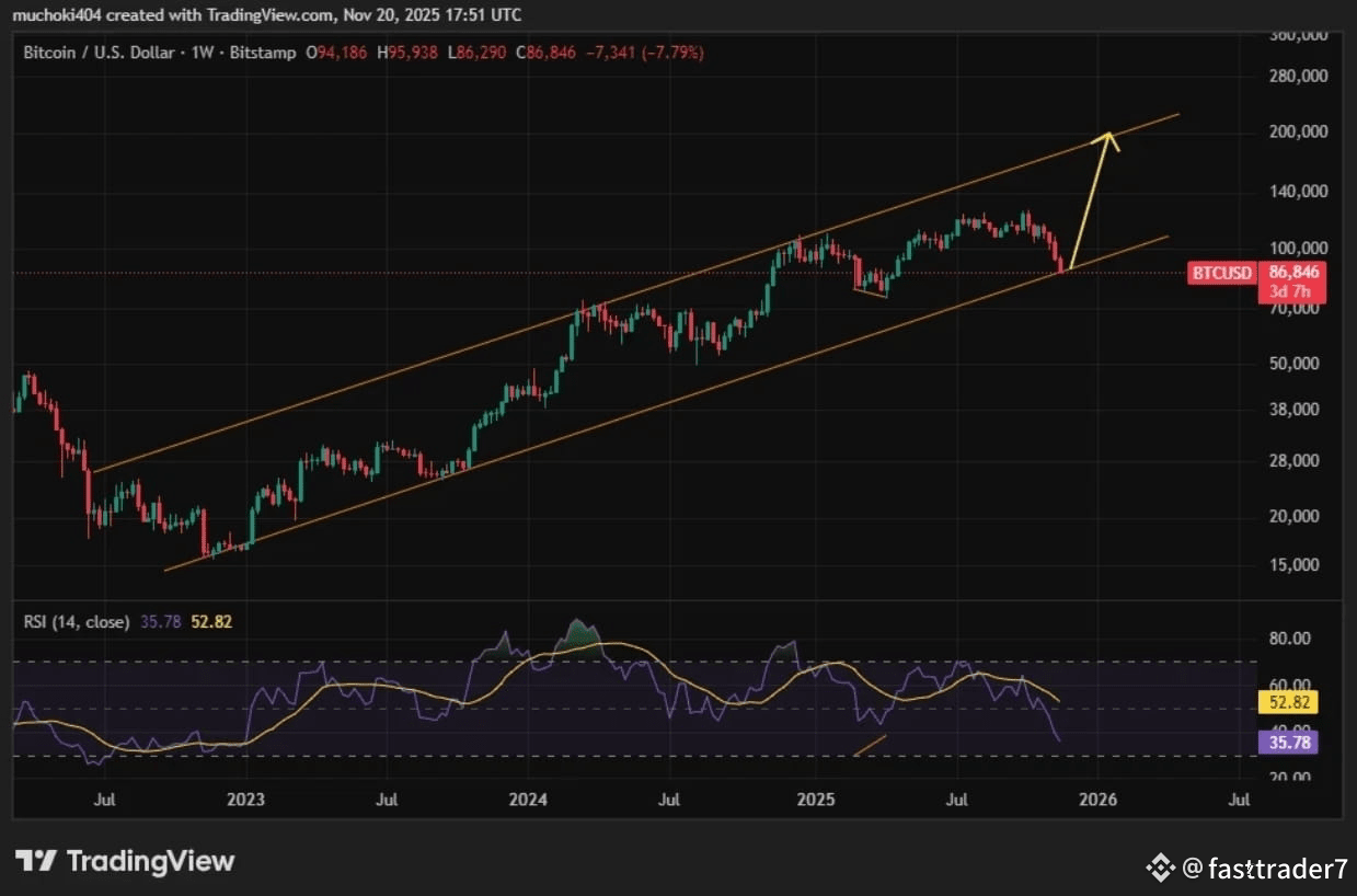 In the weekly timeframe, Bitcoin price has been forming a symmetrical rising channel since early 2023. Since hitting its all-time high of about $126k in October, Bitcoin price has been trapped in a correction mode, thus retesting the lower border of its macro rising channel.