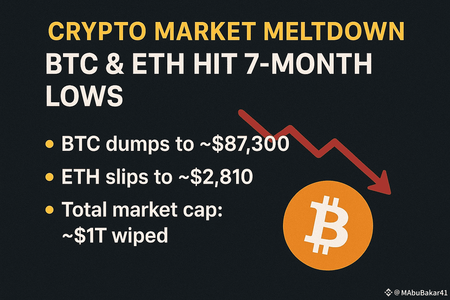 The market is bleeding as Bitcoin dumps to ~$87,300 and Ethereum slips to ~$2,810, wiping out over $1T from total crypto market cap. The October rally has fully reversed, and macro pressure is shaking investor confidence.