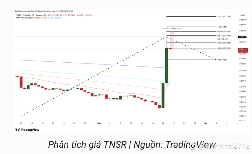 Tensor hiện giao dịch quanh mức 0,24 USD sau khi từng đạt 0,36 USD. Để duy trì đà tăng, đồng tiền cần vượt qua các ngưỡng kháng cự 0,36 và 0,38 USD. Nếu Bitcoin tiếp tục giảm và mối tương quan âm vẫn được duy trì, TNSR có thể tiến tới 0,44 USD, thậm chí là 0,72 USD dựa trên các mức mở rộng kỹ thuật.