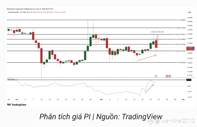 Dòng tiền cũng xác nhận sức mạnh ngắn hạn của Pi Coin. Chỉ báo Chaikin Money Flow (CMF) – đo lường dòng tiền lớn vào/ra khỏi tài sản – liên tục duy trì trên ngưỡng 0, cho thấy áp lực mua vẫn chiếm ưu thế. Từ ngày 14 đến 21/11, cả giá và CMF đều hình thành các đáy cao hơn, phản ánh sự tham gia mạnh mẽ của các nhà đầu tư lớn trong đợt hồi phục gần đây.