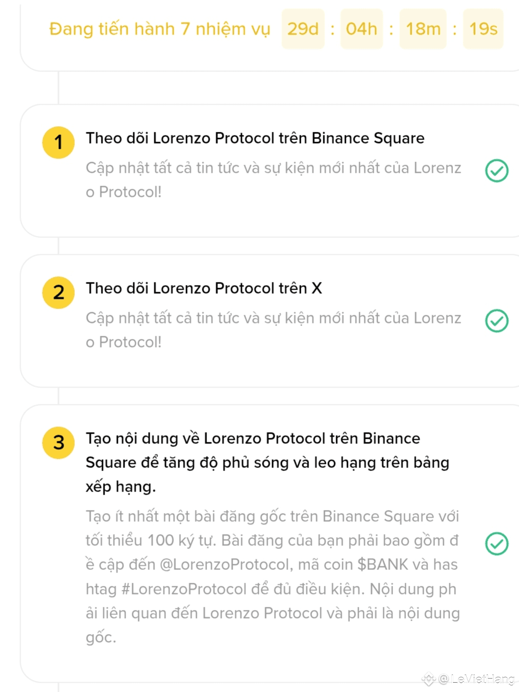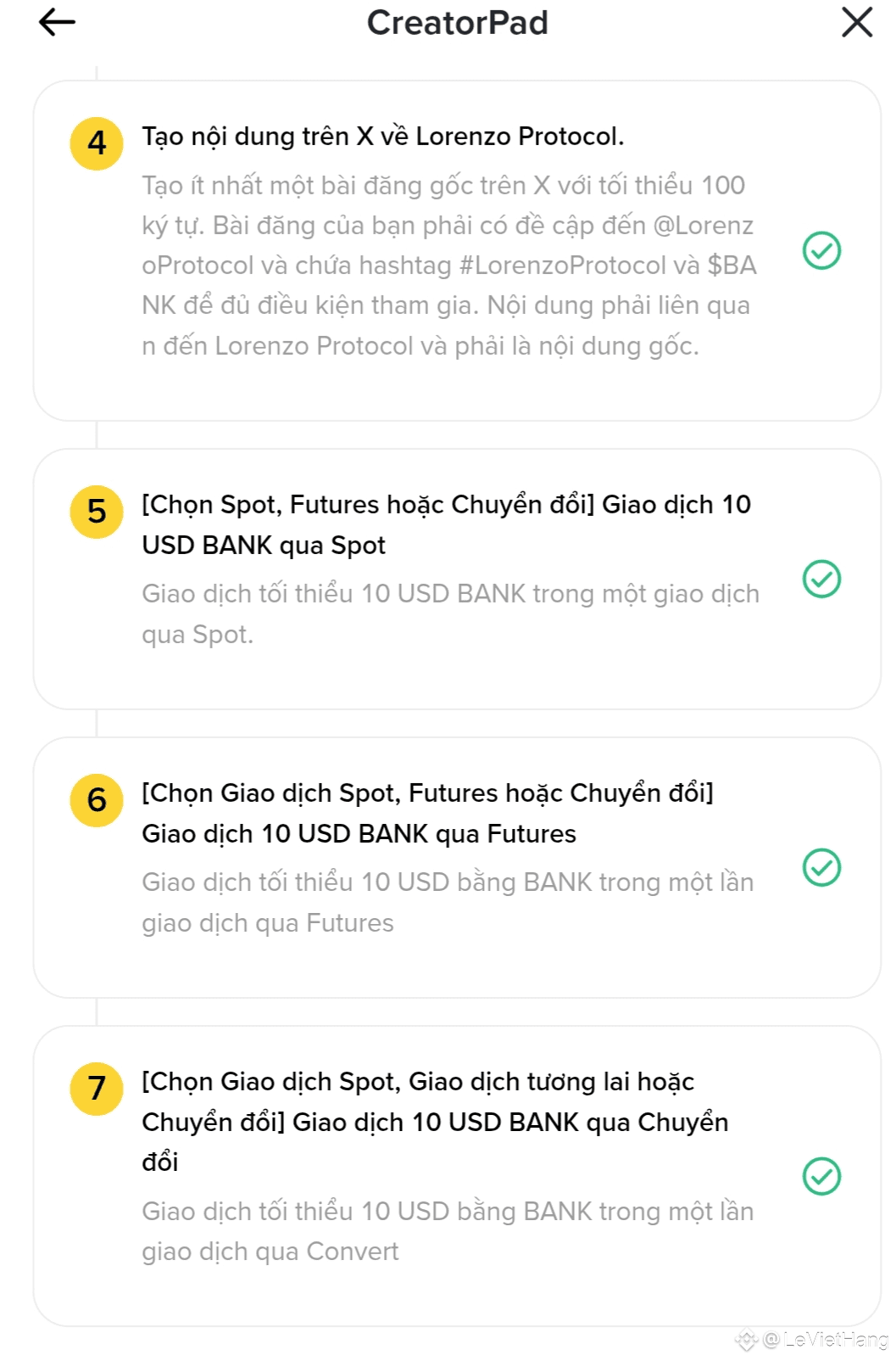 Hoàn thành 7 nhiệm vụ để mở khóa phần thưởng token #BANK trị giá 1.890.000. 100 người sáng tạo hàng đầu trên Bảng xếp hạng dự án 30 ngày của Lorenzo Protocol* sẽ chia sẻ 70% tổng giá trị phần thưởng và tất cả những người tham gia đủ điều kiện còn lại sẽ chia sẻ 20%. 50 người sáng tạo hàng đầu trên Bảng xếp hạng người sáng tạo Square 7 ngày tính từ ngày ra mắt chiến dịch sẽ chia sẻ 10% tổng giá trị phần thưởng. *Để đủ điều kiện cho Bảng xếp hạng dự án Lorenzo Protocol bạn phải hoàn thành Nhiệm vụ 1 và 3 cộng với Nhiệm vụ 5, 6 hoặc 7. Để đủ điều kiện nhận phần thưởng bạn phải hoàn thành thêm nhiệm vụ theo dõi X và đăng bài (Nhiệm vụ 2 và 4). Lưu ý: Nhiệm vụ 2 và 4 không ảnh hưởng đến thứ hạng của bạn. Các bài đăng liên quan đến Red Packet hoặc quà tặng sẽ không đủ điều kiện. Người tham gia có hành vi đáng ngờ về lượt xem, tương tác hoặc nghi ngờ sử dụng bot tự động sẽ bị loại khỏi hoạt động. Bất kỳ sửa đổi nào đối với các bài đăng đã xuất bản trước đây có lượng tương tác cao để tái sử dụng làm nội dung dự án sẽ dẫn đến việc bị loại. Phần thưởng sẽ được phân phối vào ngày 09/01/2026 trong Trung tâm phần thưởng.