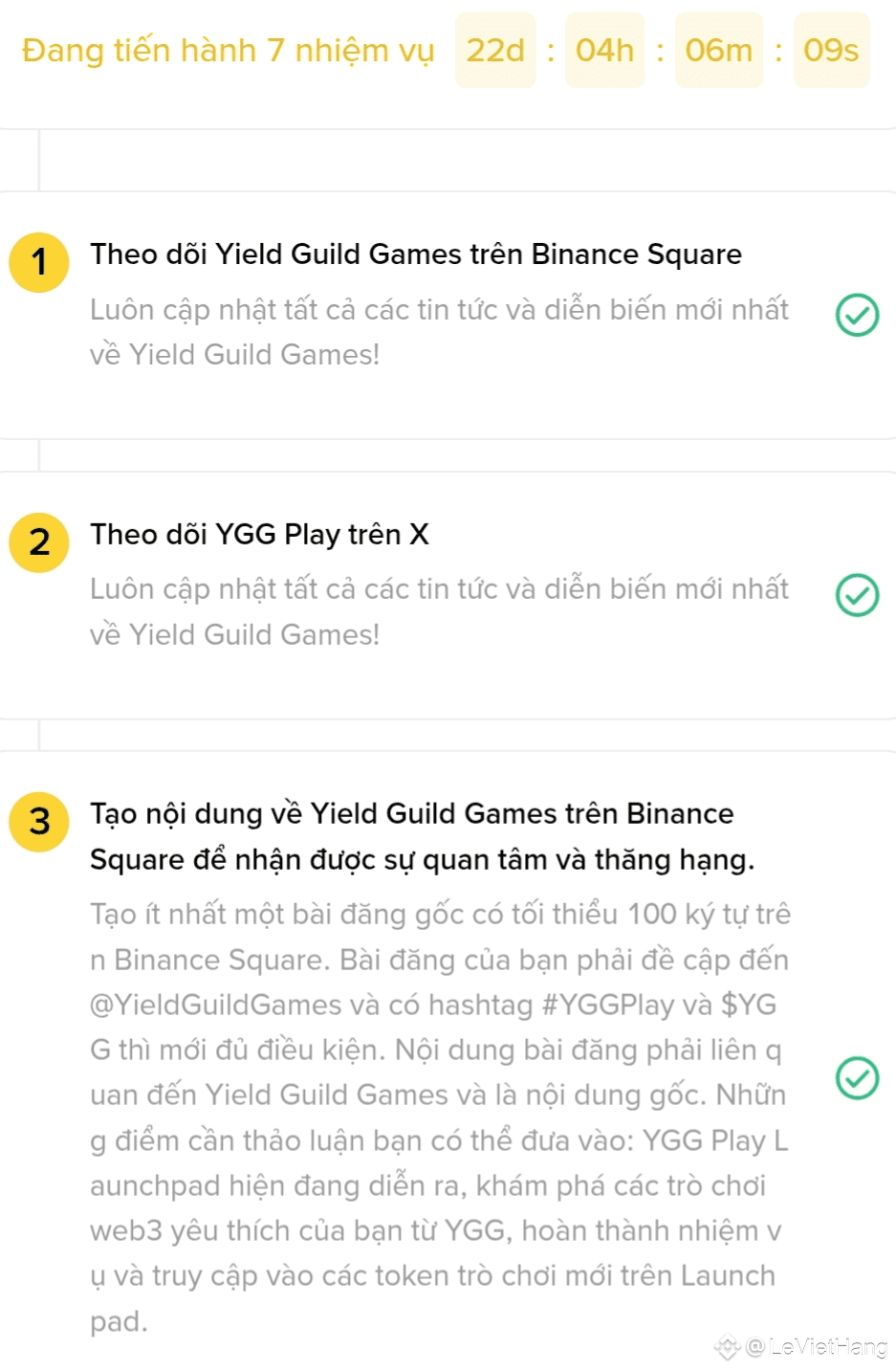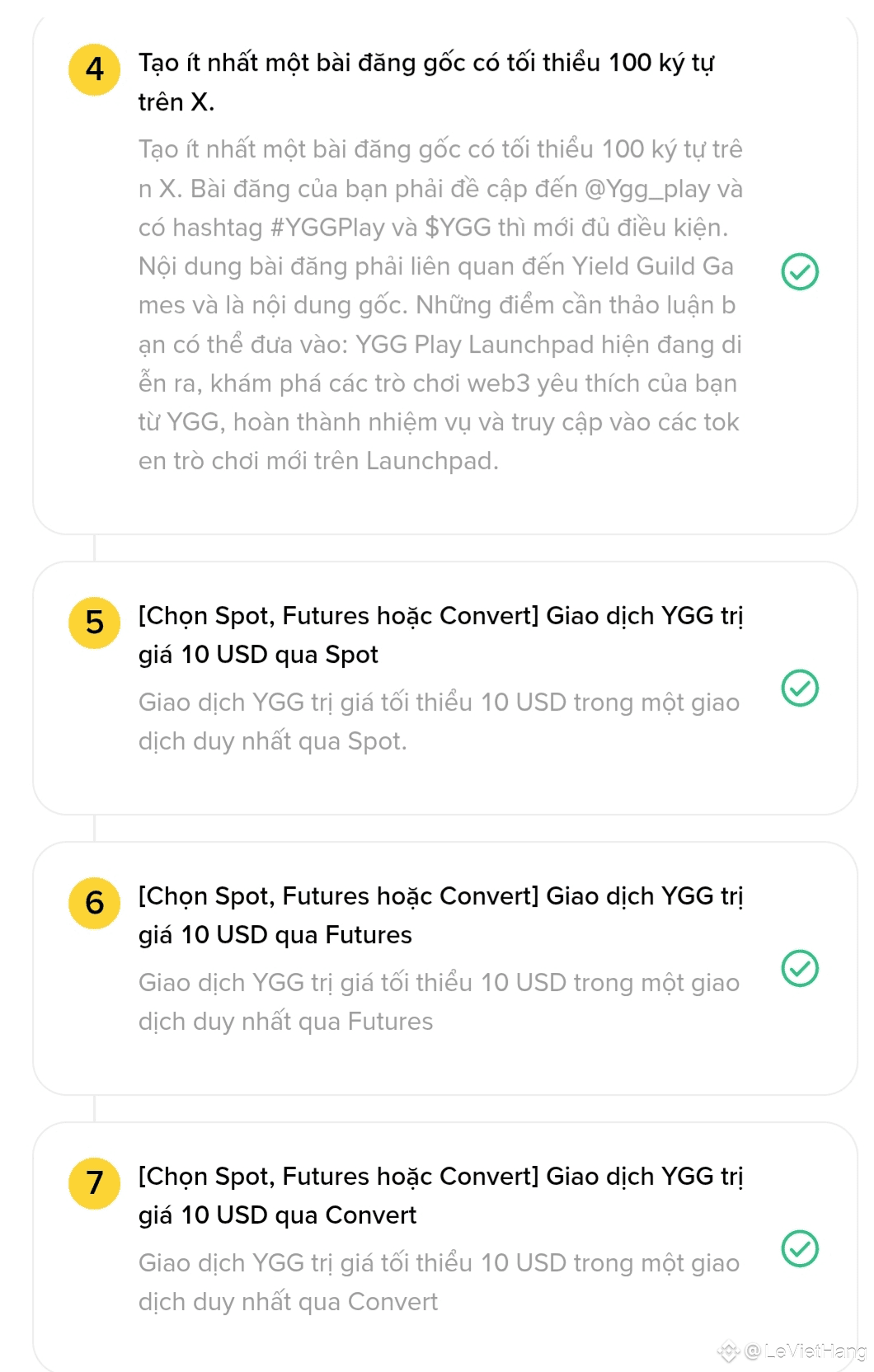 Hoàn thành tất cả các nhiệm vụ để nhận một phần từ quỹ thưởng trị giá 833.333 token YGG. Quỹ thưởng sẽ dành 70% cho Top 100 nhà sáng tạo trên Bảng xếp hạng dự án 30 ngày của Yield Guild Games và 30% cho tất cả những người tham gia đủ điều kiện. *Để đủ điều kiện tham gia Bảng xếp hạng dự án của Yield Guild Games, bạn phải hoàn thành nhiệm vụ 1 và 3 cùng với nhiệm vụ 5, 6 hoặc 7. Để đủ điều kiện nhận một phần từ quỹ thưởng, bạn phải hoàn thành thêm nhiệm vụ theo dõi và đăng bài trên X (nhiệm vụ 2 và 4). Lưu ý: Nhiệm vụ 2 và 4 không ảnh hưởng đến thứ hạng của bạn. Các bài đăng liên quan đến bao lì xì hoặc quà tặng sẽ bị coi là không hợp lệ. Những người tham gia bị phát hiện có lượt xem, tương tác đáng ngờ hoặc bị nghi ngờ sử dụng bot tự động sẽ bị loại khỏi hoạt động. Bất kỳ hành vi chỉnh sửa bài đăng đã công bố trước đó với lượng tương tác cao nhằm mục đích tái sử dụng làm bài dự thi sẽ bị loại. Phần thưởng sẽ được phân bổ muộn nhất vào ngày 31/12/2025 trong Trạm phần thưởng.