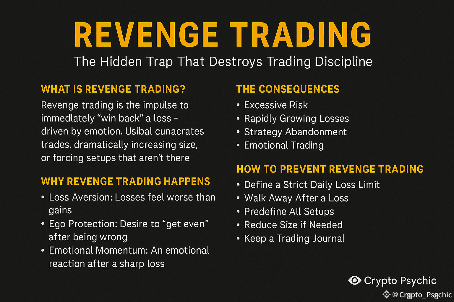 Revenge trading is the impulse to immediately “win back” a loss by re-entering the market without a valid setup.
