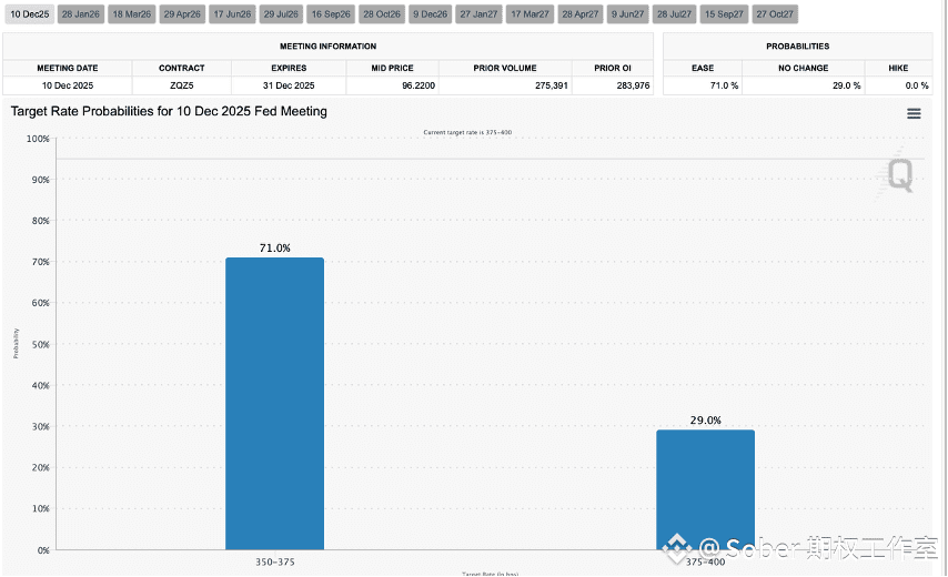这种“信息真空”对风险资产是致命的。 即使CME FedWatch显示12月降息概率回升至71%(市场押注年内共降息75bps),资产价格却并未跟随上涨。原因在于,市场担忧在缺乏数据支撑的情况下,美联储的降息可能被视为一种“恐慌性举措”而非“预防性举措”,或者美联储因缺乏数据而选择暂停降息,导致政策失误。市场厌恶的不是坏消息,而是不确定性。当前这种“因数据缺失导致的二阶不确定性”,使得资金更倾向于场外观望,而非入场博弈。