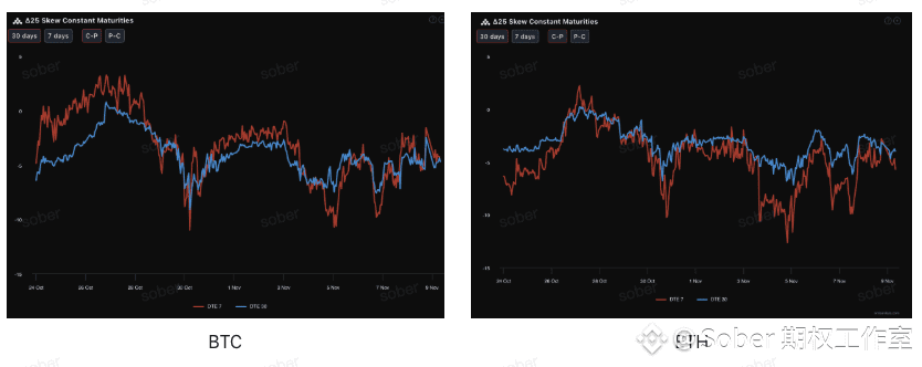 通过Delta 25 Skew(看涨期权隐含波动率IV - 看跌期权IV)观察,该指标的负值幅度反映了市场对下行尾部风险的对冲需求。