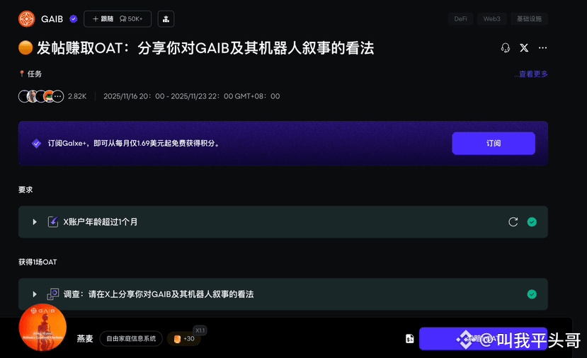 两分钟让你零撸GAIB究极大毛!平头哥领了980枚GAIB代币,价值一百多u,可比刷Alpha性价比高多了!全程0成本,简单两步两分钟搞定,保姆级教程来了!