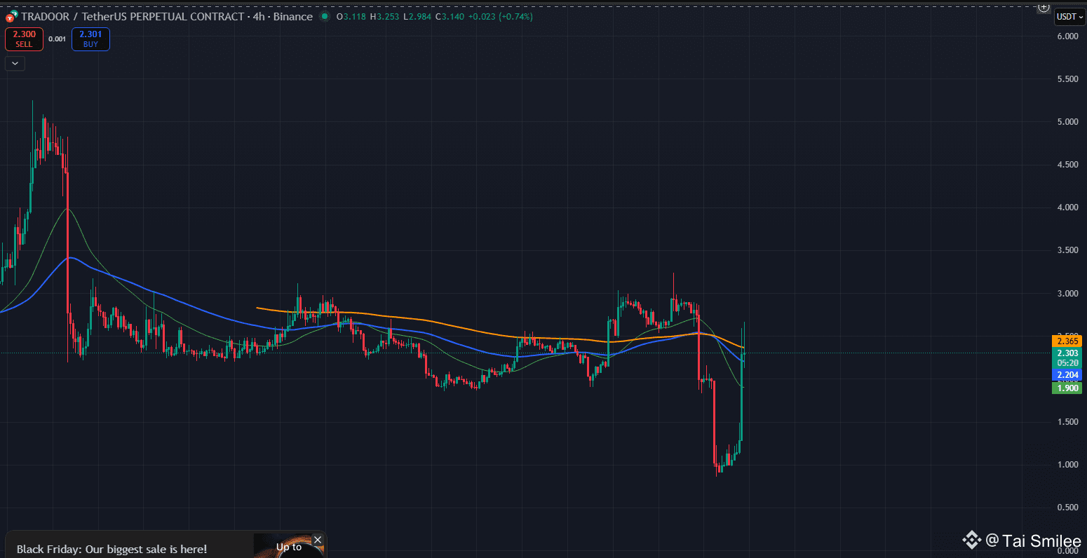 $TRADOOR vừa có cú hồi mạnh trên khung 4H sau pha rơi sâu, nhưng giá hiện đang chạm lại vùng kháng cự của cụm MA (MA50 – MA100 – MA200). Đây là vùng mà trước đó giá luôn bị từ chối.