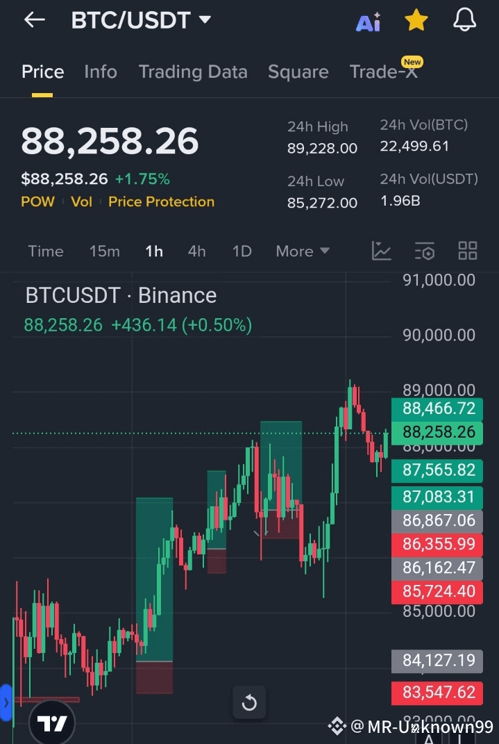 $BTC is currently trading at $88,258 (+1.75%), showing steady bullish pressure throughout the last 24 hours.