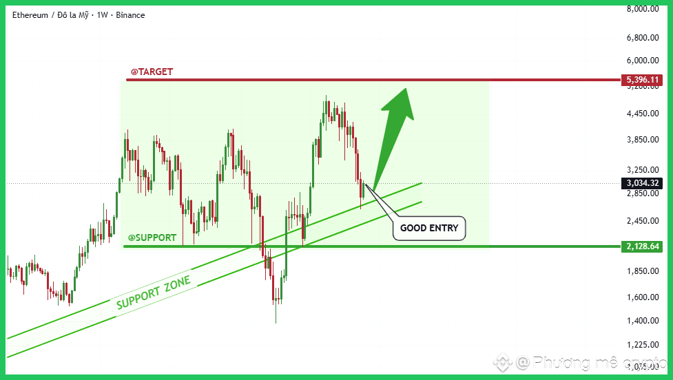 Ok anh em, cùng mổ xẻ chart $ETH cực ngon này xem có gì hay ho không nhé. Đây là biểu đồ nến tuần (1W), cho thấy $ETH đã trải qua một đợt điều chỉnh sâu và hiện đang chạm lại đường xu hướng tăng dài hạn, quanh mức giá 3,034 USD. Điểm này được đánh dấu là vùng vào lệnh tốt (GOOD ENTRY).