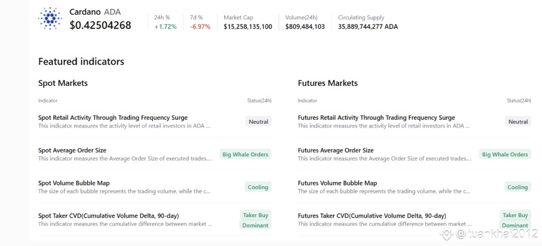 Dữ liệu tổng hợp từ CryptoQuant tiếp tục củng cố triển vọng tích cực của ADA. Trên cả thị trường giao ngay lẫn phái sinh, các lệnh mua quy mô lớn từ cá voi xuất hiện dày hơn, trong khi các chỉ số cho thấy thị trường đang “hạ nhiệt”. Sự áp đảo của lực mua trong bối cảnh này trở thành tín hiệu rõ ràng báo trước khả năng phục hồi.