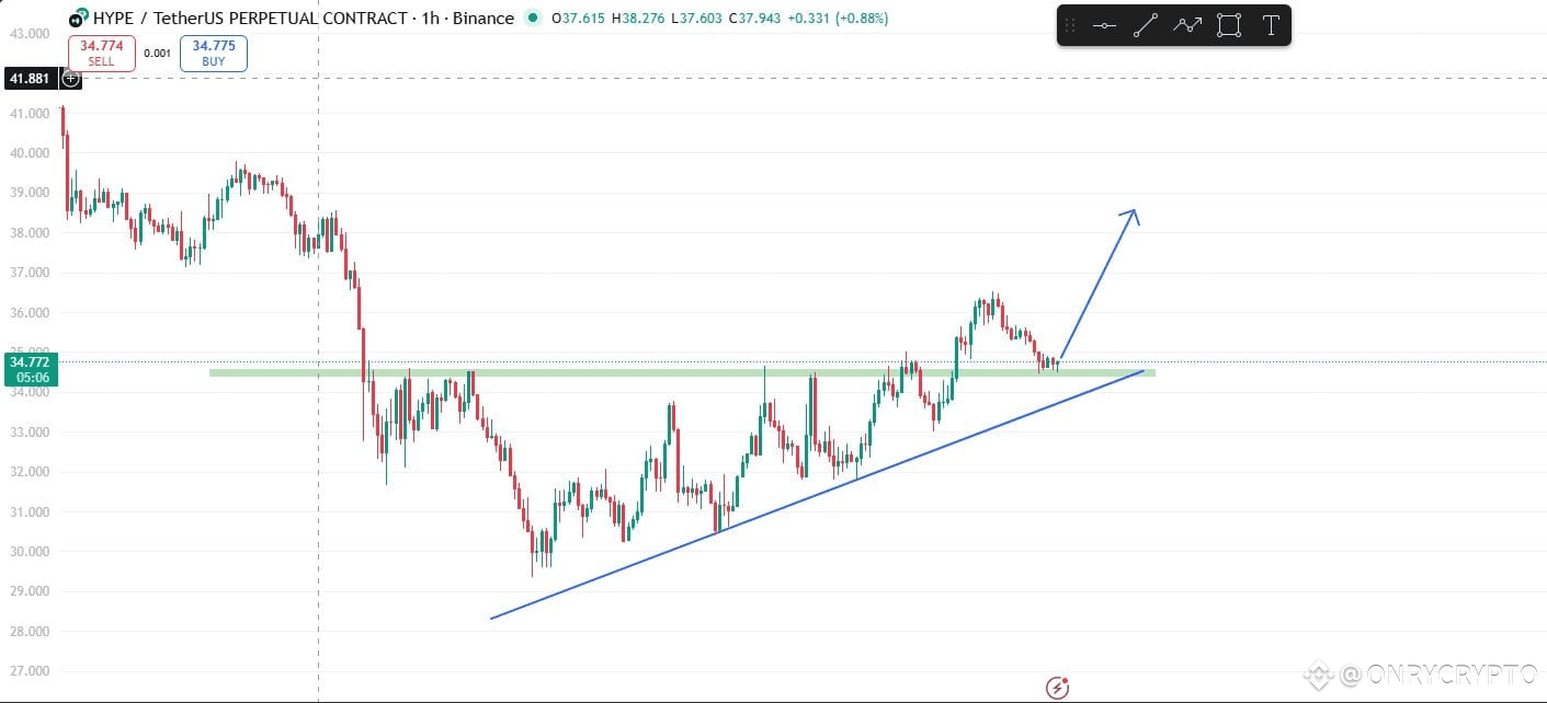 Hope you can see this HYPE chart. The chart shows HYPE forming a steady uptrend, HYPE has broken out of an ascending triangle which is bullish pattern and is currently retesting the breakout level. A successful test of the breakout zone could trigger a solid bullish rally. 🚀